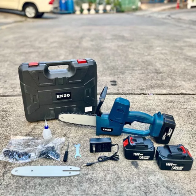 เลื่อยโซ่แบต Enzo 168V บาร์ 9 นิ้ว โซ่ 2 เส้น แบต 2 ก้อน ตัดต้นไม้ ตัดกิ่งไม้ ยกไปตัดที่สูงๆ สบายๆ น้ำหนักเบา ตัดเร็ว พกพาไปได้ทุกที่